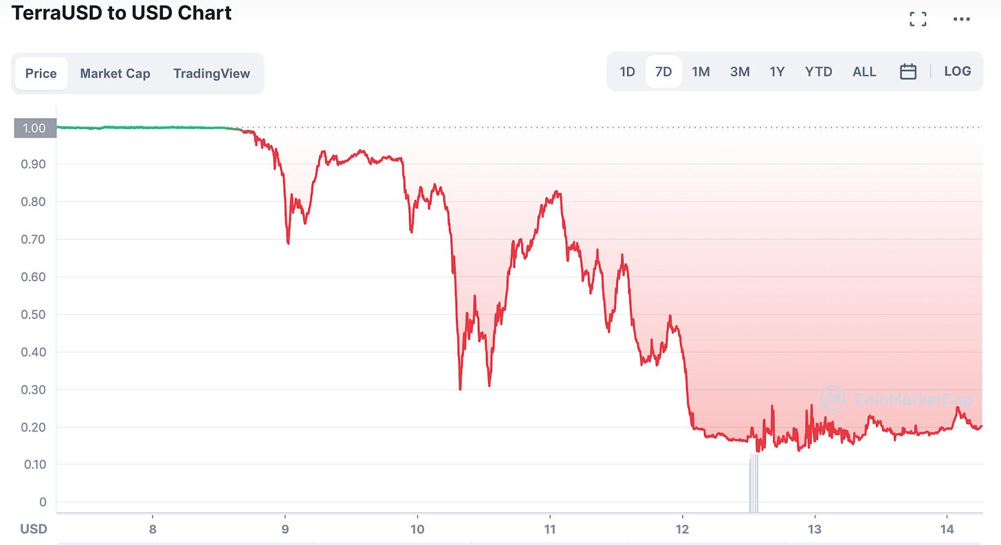Since last weekend, UST's conversion ratio has moved wildly up and down and is currently at around $0.20 to the dollar. Some $40 billion of value in UST's companion coin Luna was wiped out throughout this process. And the panic also dragged down other cryptocurrencies.